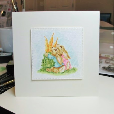 This old set from Close To My Heart has the sweetest images. I thought of it immediately when I saw the new challenge at AAA Cards! I used a piece of watercolor paper and stamped the image in Antique Linen and then painted the image with Distress inks for a no-line watercolor. When dry, it was cut with a stitched square and I backed it with a square of fun foam for some dimension on a cream 5" square card base. I will keep the sentiment inside the card to not distract from this little picture.